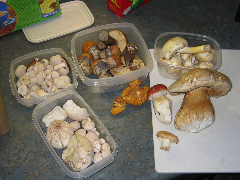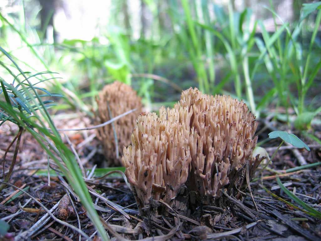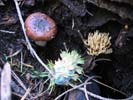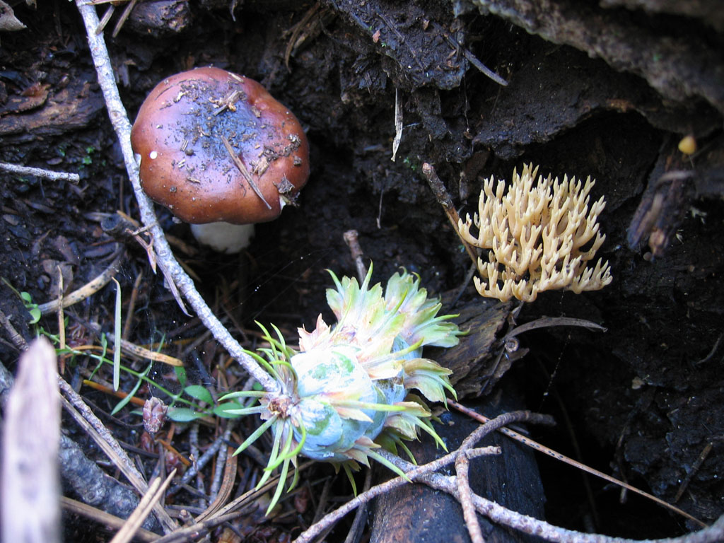 A Russula and a coral and an undeveloped pinecone