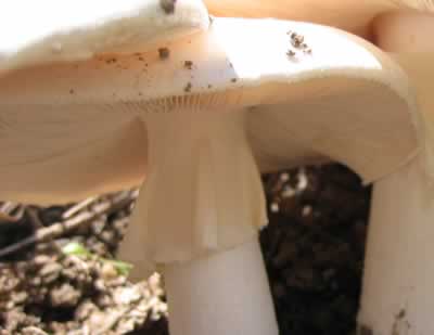 Skirts Similar to a ring, a skirt is a larger partial veil that remains mostly intact after tearing, with an attatchment point that is often at the stem-cap interface. Skirts are most often associated with the genus Amanita, but Agaricus and several other genera also can have them. The photo to the right is of Amanita phalloides, the death angel. It is important to know that the genus Amanita does include some members that are skirtless, such as the grisettes. |