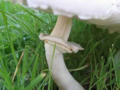 Rings / SkirtsRings, skirts, and similar ornamentation on the stem are commonly found. These features are often diagnostic, and shared amongst all species of a certain genus. In some cases, you can identify a mushroom to the genus by simply looking at the ring. Rings, skirts, and the like are the remnants of a protective membrane from the button stage called an annulus, or partial veil. When young, the gills were protected by this membrane which connected to the edge of the cap on one end, and the stem on another. As the mushroom matures and the cap expands, this membrane tears and leaves remnants on the stem and sometimes on the cap edge. The manner in which the partial veil connects the cap to the stem, and the method in which it tears, will determine the appearance of the ring. In some cases, the partial veil disintegrates, so is only evident in immature mushrooms. And of course, not all mushrooms have a partial veil. |
